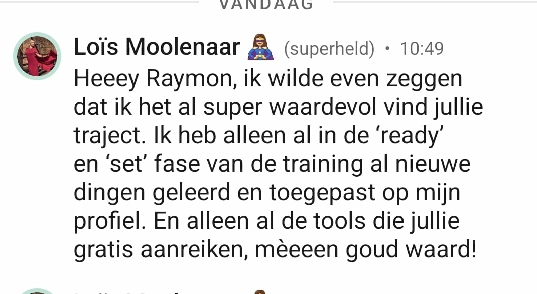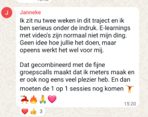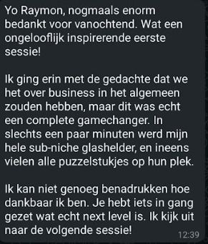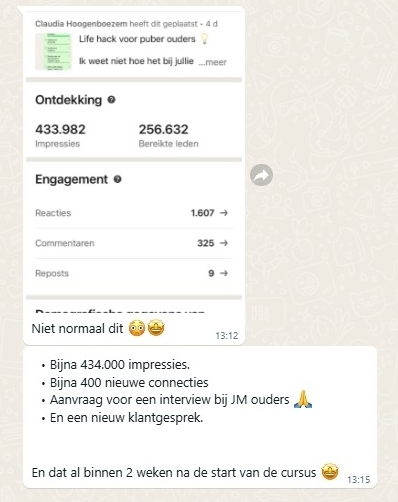 “9 nieuwe klanten in 1 maand via LinkedIn. Ik had zóveel aanvragen dat ik zelfs geen tijd meer had om naar de sessies te komen. Investering in no-time terugverdiend. De sessies zijn trouwens ook heel leerzaam. Ook heel fijn dat iedereen zo met elkaar meedenkt.”